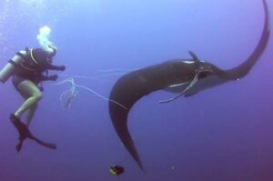 The images from this event are simple in composition. A diver, a large ray, and a few strands of line tell the entire story. The most striking frames show the moment just after the line falls away, when the manta begins to swim freely again through clear blue water.